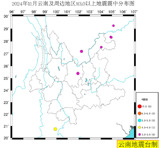 2024年11月云南及周边地震活动概况:云南及周边地区(北纬20°~30°,东经96°~107°)共发生地震892次。按M统计,其中M3.0~3.9级6次、M4.0~4.9级1次,该区域最大地震为11月08日00时30分缅甸M4.2级地震,省内最大地震为11月10日09时35分云南禄丰M3.9级地震。(注:M为国家标准震级)